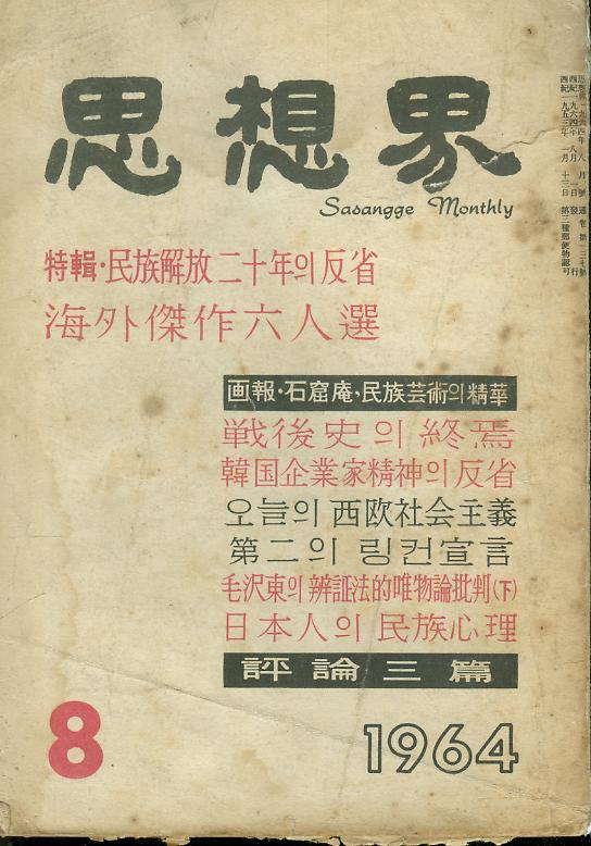 This idle class of educated young men, with a strong sense of self-entitlement, sat around and discussed Great Things. Seoul had at the time an active and vibrant intellectual atmosphere. The two leading political and literature journals were Creation & Criticism (창작과 비평), which had a circulation of 18,000 in 1960, and World of Thought (사상계). We know World of Thought must have been good because it was frequently being shut down by the government. As historian Gregory Henderson notes, when Chang Myon (장면, 張勉) was prime minister in 1960 — after the exile of Rhee and before Park launched his coup d’état — one survey reported that there were 100,000 journalists in the country, most of them in Seoul. Everyone was reading and everyone was writing.